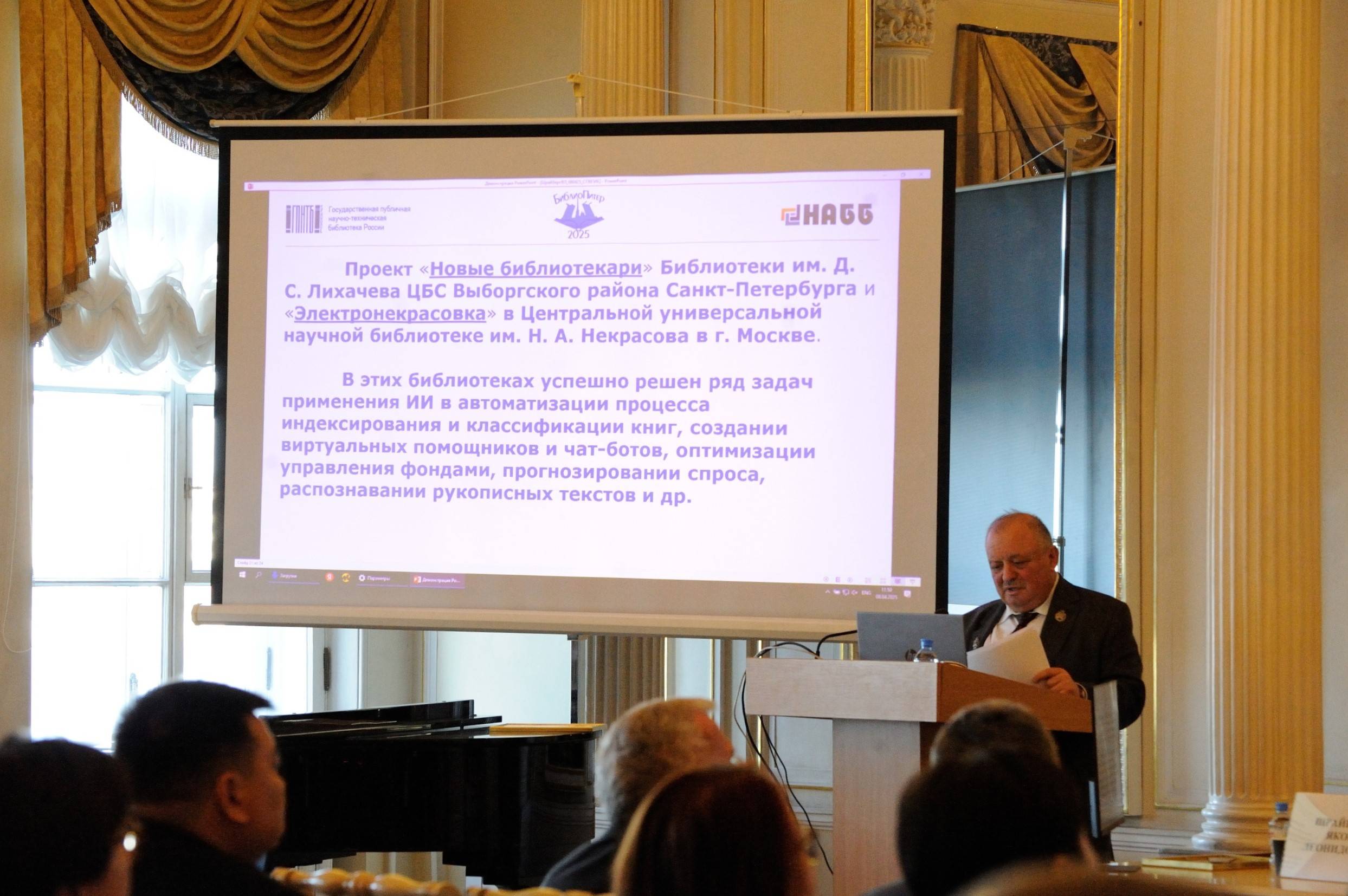 В своём выступлении Яков Леонидович подчеркнул роль библиотек в информационном обеспечении науки и образования. А в качестве примера внедрения искусственного интеллекта (ИИ) в культурных учреждениях упомянул проект Библиотеки им. Д. С. Лихачёва – «Новые библиотекари», а также «Электронекрасовка» Центральной универсальной научной библиотеки им. Н. А. Некрасова (Москва). Яков Леонидович отметил, что в этих библиотеках успешно решён ряд задач применения ИИ.