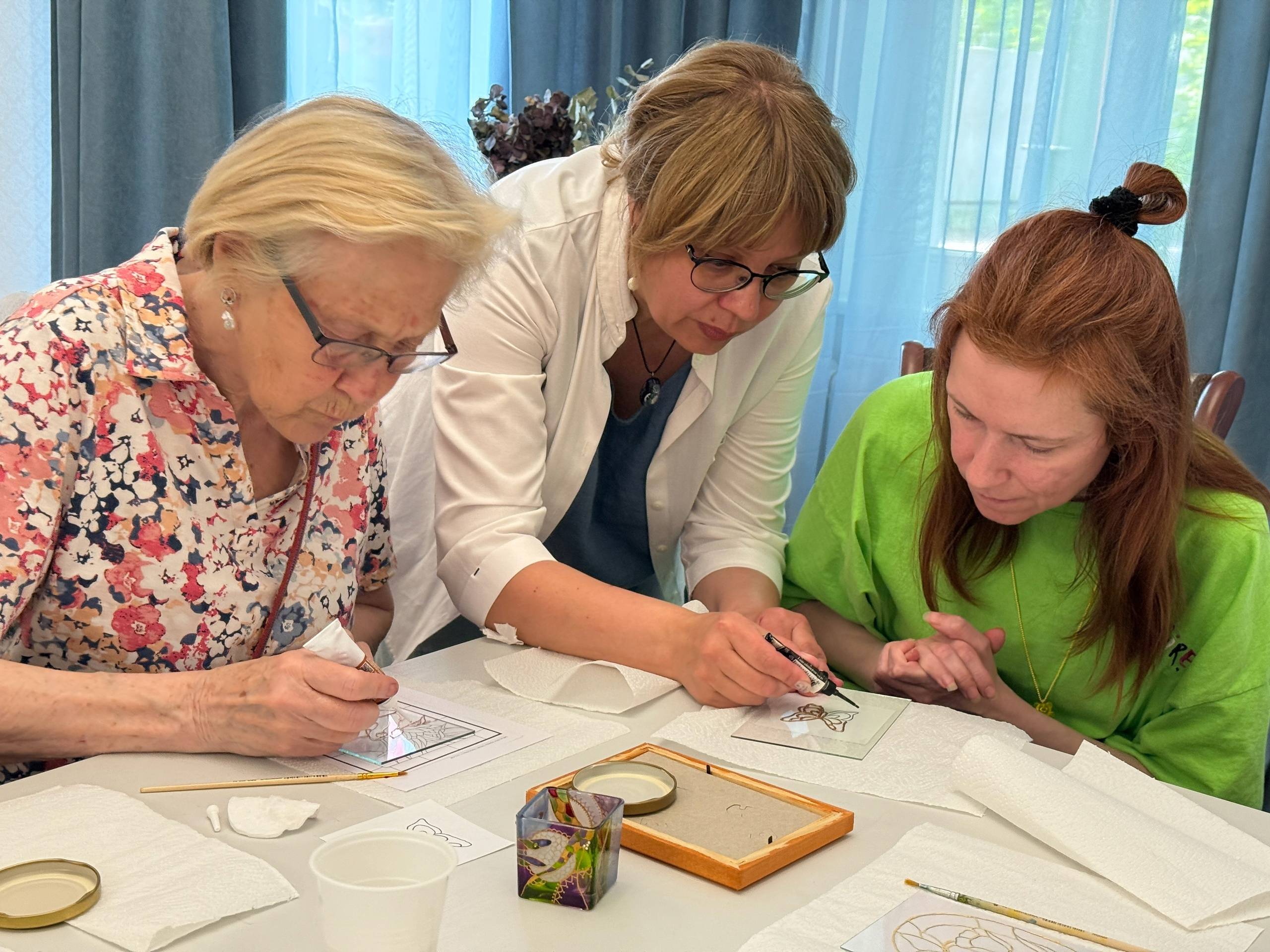 Алёна подробно рассказала о материалах, показала технику нанесения краски на стекло, и помогла каждому создать свой неповторимый рисунок. Вместе мы раскрыли волшебство витражной росписи!